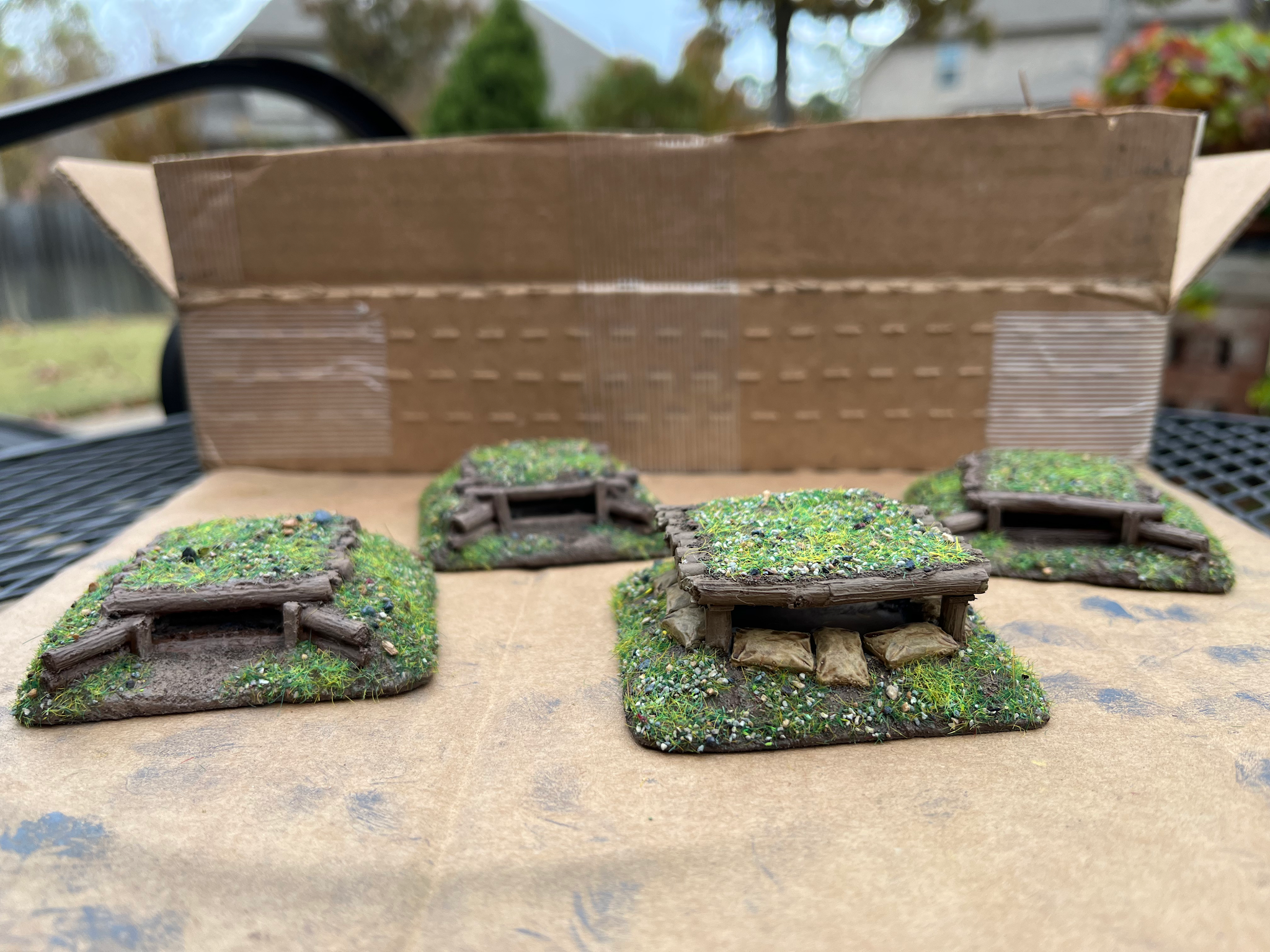 These are based on MDF/hardboard which is good and sturdy. Best to cut with a jigsaw. I built up some height with strips of foamcore board and built the structure of the bunker from twigs and cake pop sticks from the craft store. I used Vallejo texture paste mostly for the ground texture and then painted and applied static grass and Geek Gaming Scenics basing mix like I use on my Soviets. The sandbags on the command bunker are resin, from JTFM/Die Waffenkamer in Canada.